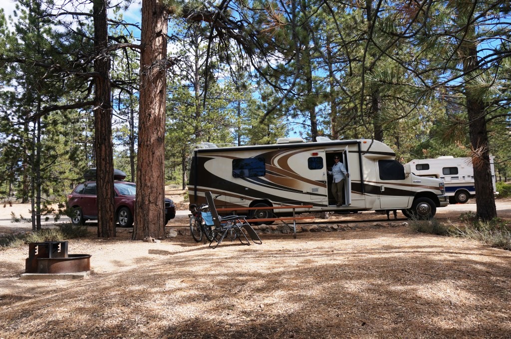 We thoroughly enjoyed our stay at Bryce Canyon. There was no problem getting a campsite though we first went to Sunset Campground and were not impressed with the lumpy, uneven, short sites in the RV loop. We skedaddled back to North Campground and found a beautiful, reasonably level site and snagged it quickly (the camera is tilted left, not the campsite – the rig is level).