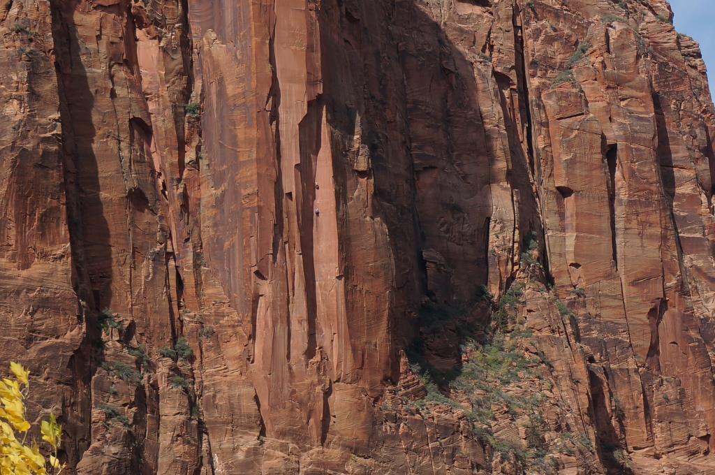 Other – they have a Nature Center but it is only open mid-May through mid-August so we missed that. There are amphitheaters for evening programs but those were done for the season. The Zion Lodge has a restaurant (somewhat pricey, didn’t eat there so no review on the food) and a snack bar type place that serves fast food, beer, ice cream, etc. There is also a gift shop with some different items than what they sell at the visitor center so it is worth checking out. Bicycling is allowed on park roads and on the Pa’rus trail which runs 1.7 miles between the visitor center and Canyon Junction shuttle stop at Hwy 9 where the Zion Canyon Scenic Drive heads up the canyon with restricted access. Each shuttle is capable of carrying at least 2 bikes. Zion is also very popular for Rock Climbing as seen in the picture below… well, they can be seen if you zoom in enough to spot the two climbers just left and up of center in the photo. They are on the lighter section of cliff face below the jagged edge and shadow. They are UP there… and we only managed to fit half to two-thirds of the height of that cliff in the picture. We can only assume they intend to climb to the top. We saw climbers on the shuttle with massive bags full of ropes, carabiners and other gear. They must have a hundred pounds of stuff hanging on them when they start the climb. The ones we saw heading out had huge smiles and gazed at the cliffs like they’d reached paradise.