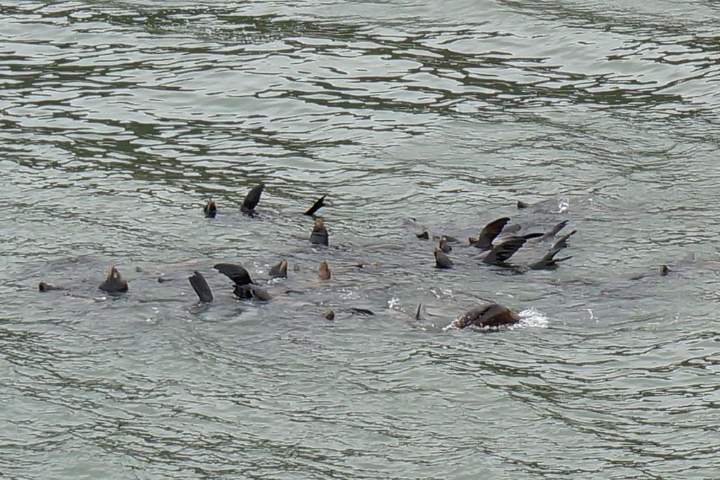 When we pulled our eyes away from the animal antics right in front of us, we spotted several “rafts” of sea lions floating along in the water. It looked like a dozen or so sea lions somehow holding together, many with one flipper raised in the air. It begged the question – can sea lions hold flippers under water to keep themselves together? Or to simplify the question – How do they DO that?