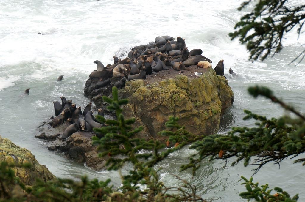 Just south of Shore Acres is a parking area with views off the coast. The offshore area is part of Oregon Islands National Wildlife Area and is FULL of critters. We saw California Sea Lions, Stellar Sea Lions, Harbor Seals, Black Oystercatchers, Pelagic Cormorants and more. (No whales yet, still looking.) The sign says Northern Elephant Seals frequent this area but we didn’t see any of those either… at least not the huge males with the big nose flaps.