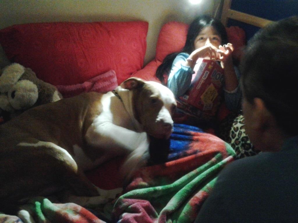 Chloe told us that she really, really wanted the bed so she could set up the reading nook underneath but a few other comments clued us in on another reason – more room for sleepover guests. Poor Daddy. He’s in for some very long, noisy nights… and will probably be getting a lot of child-applied facials and pedicures. When Chloe returned from her New Year’s eve sleepover, she squealed when she spotted the bed and immediately grabbed a book and crawled into her special nook to read. Chip, her 100 lb love muffin pit bull, crawled right in after her and settled down for his bedtime story. Unfortunately, I didn’t get the picture of Chloe, Daddy, Cocoa, AND Chip all snuggled in for story time. THAT would have been an awesome family photo.