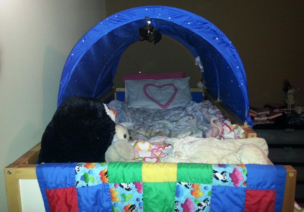 Both levels have a clip on pink reading lamp. This save batteries since she used to sneak a book into bed and read by flashlight anyhow. Now there is a reading light ready no matter where she lands. We throw a bunch of pillows and stuffed animals into the nook and Chloe has her “special place” for reading or hanging out. The whole bottom of the bed glows pink. The curtains and duvets come in many colors so you don’t have to go with pink overload like we did. As a side note, the shimmery curtain panels are inexpensive and make great play silks. We have pink, blue, purple, and black and have been transformed into butterflies, bats, caterpillars, princesses, villains and anything else a creative mind can think up.