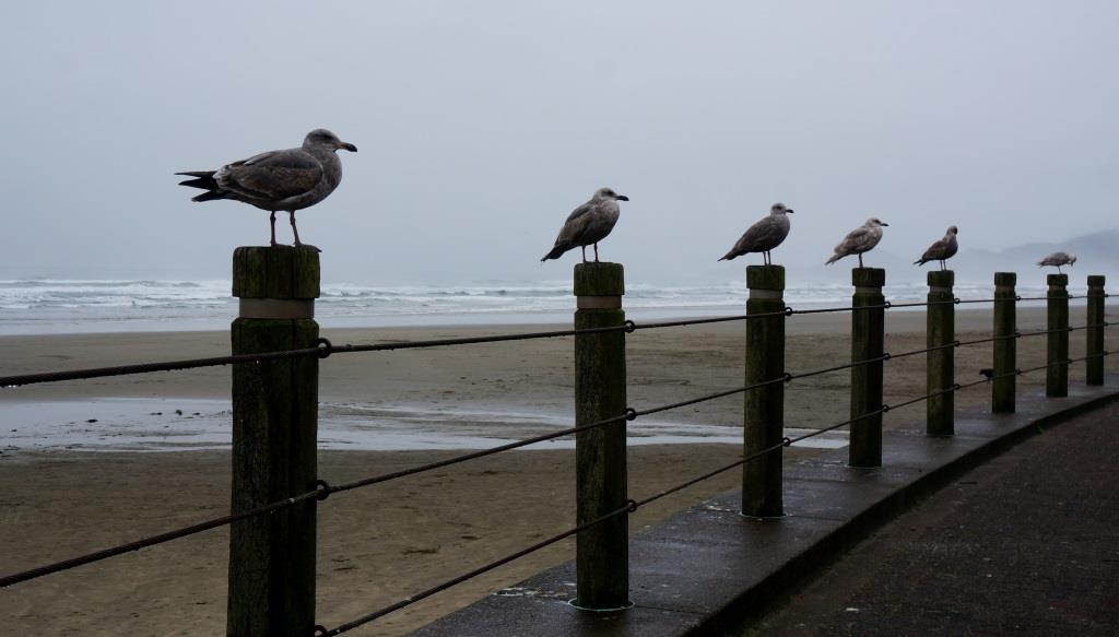 We wanted to see some of the other sights that Newport had to offer. So on a cool, cloudy, misty day we drove to Nye Beach and wandered around that district for several hours. NW Beach Drive loops down to a small parking lot near the beach, which is where we parked. An honor guard of sea gulls greeted us, although several appear to have deserted their posts.