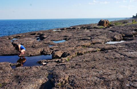 After dragging her out of the water, we found a very cool spot on the shore with a billion year old lava flow. The lava had cooled by this time, but it was still hot. And humid.