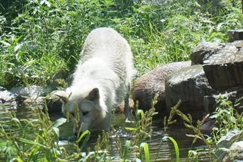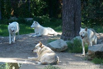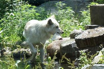 The rest of the wolves are in the large enclosure behind the Wolf Center with walls of glass to facilitate viewing. There is some kind of enrichment around noon every day and the wolves usually come right up by the glass to get whatever goodies have been put out for them. The yummy of the day when we visited was deer leg popsicles… uh, yum? It was quite hot while we were there so most of the time the wolves were chillin’ in their dens back off in the enclosure where we couldn’t see them. Then it came time for treats and they wandered down looking relaxed and cool like they weren’t just coming for the goodies but we knew better.