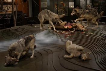 The wolf center exhibits are all about education. They have a ton of information and graphics about wolves and other animals. There is a huge diorama in the center of the exhibit hall showing wolves in natural behaviors… including dining on deer. Wolf/predator + deer/prey= dinner.