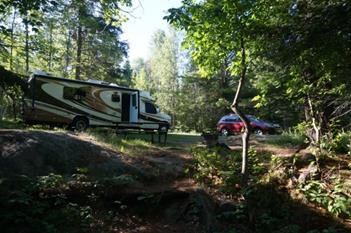 Boat tours were settled; lodging was the next challenge. Voyageurs has no campground on the mainland (and only boat in camping in the park) and the few public campgrounds were a bit pricey for what we would need so we settled on Woodenfrog Campground in the State Forest right on Lake Kabetogama. It is walk in only but the ranger said he’s never seen it full so we took a chance. It also has no hookups but we lucked out and the weather was moderate while we were there. Some of the sites would have been tricky to get level but there were plenty to choose from even though we rolled in on a Saturday. We got a nice level site backing to the lake with a trail down to the water and beautiful pine trees on which to hang our hammocks. It was also close to the entrance so we avoided having to twist our way through the whole campground each time we went in and out. If our inflatable kayaks had been on board, we would have opted for a site closer to their little dock and launch area. But, alas, we were dependent on getting boats elsewhere.