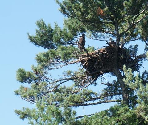 Preliminaries settled, we were off to Canada! Sort of. We took the Ranger led Kettle Falls Boat Tour out of Kabetogama Visitor Center. Our Ranger was very good and gave us all kinds of history and information about Voyageurs. It was a long tour with lots of stops for eagle watching. The young had just fledged and we saw a few clinging to the nest, a few on the ground, and a few that had rolled out to sit on other trees. Pretty much all of them were looking around and seemed to be thinking “What do I do now?” The adults were nearby to either render assistance or maybe guard the newly empty nest… from their chicks. Time to fly little ones!