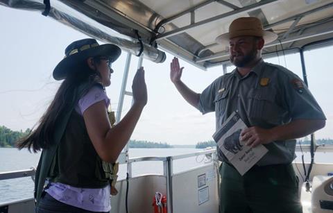 On land, the markers are single numbered obelisks sitting on the border itself. That doesn’t work on a lake so the obelisks are paired with matching numbers on the shore of the lake in each country. The border lies dead center between them. The international border through the lake is basically the route the Voyageurs took on their way through the area. It was their water highway. Since Chloe had learned about the Voyageurs and finished her Junior Ranger book before the tour, the Ranger swore her in on the boat as we traveled on the Voyageurs water highway and while we were in Canada! The whole boat applauded and cheered her on.