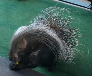 met a porcupine (she walks out and up to the platform on her own – no cage, no leash, just a big tu-tu of quills swaying as she goes),