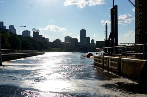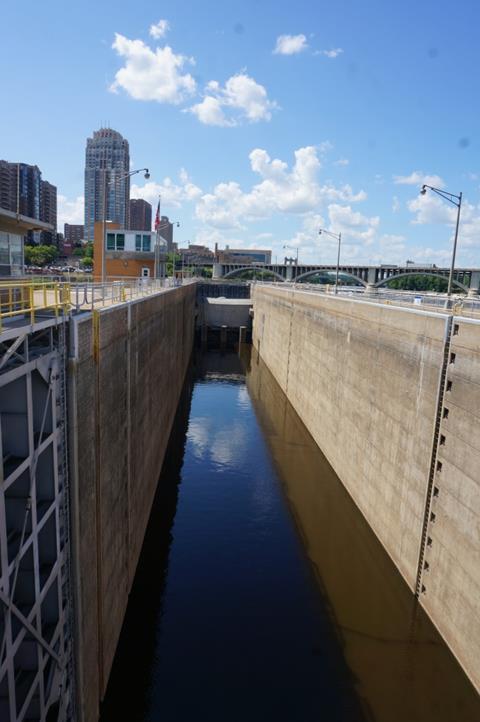 We could look down and see the next lock in the river, the Lower St. Anthony Falls Lock and Dam. Since boats can no longer access the river above Upper St. Anthony Falls, the lock does not get much use. You can go up through the lock, turn around, and go back down through the lock. More on that later.