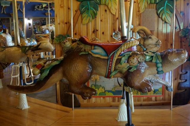 Lark Toys is an amusement park. They have a gorgeous hand carved wooden carousel – inside the building. Each animal has an information card along the outside rail explaining the different parts of the carving. There is also a putt-putt golf course just outside. And somewhere, when they aren’t hiding in their hut, there are llamas.