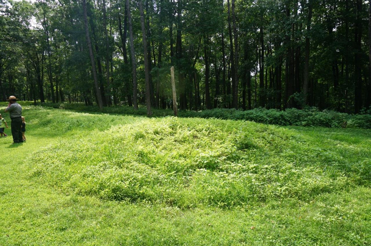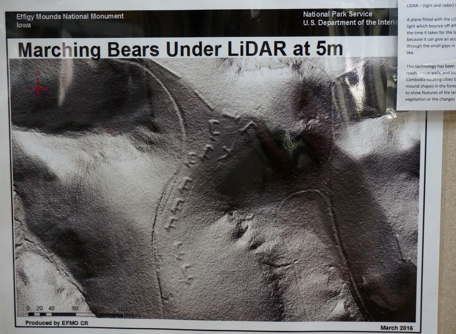 The hike was informative and we saw some compound mounds before reaching Little Bear mound followed by a long line of conical mounds. There was a beautiful view of the Mississippi River from Fire Point. The Ranger led portion ended there with a Q&A session. We had the option of retracing our steps and taking a short side hike to see the Great Bear Mound but we opted for a swift return to the (air conditioned) visitor center. The mounds are interesting but it is really difficult to actually see the shape of the mound. That requires an aerial shot without the tree canopy which is pretty impossible to get but we found this LiDAR image in the visitor center that gives you a good idea of the layout of the mounds.