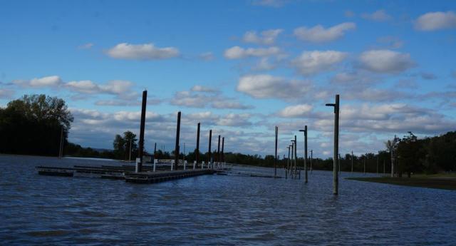 John took photos along the river the day before we left. The Illinois River was flowing rapidly UP STREAM due to the massive amount of water pushing down the Mississippi. Somewhere above us was a meeting of the flood waters coming down the Illinois and the flood waters pushing up from the Mississippi. While our campsite may have been a few feet up in elevation from the swollen river, flood forecasts called for a rise of approximately one foot per day over the next four days. That was MORE than enough to put the road, and maybe our campsite, underwater.