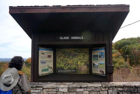 Being good tourists, we read the signs along the sidewalk in the parking lot. Holly read this “Glade Animals” sign and learned that they have road runners here… in Missouri! We’ve never seen one so Holly was determined and spent the day looking for one. Unfortunately, we don’t know anything about road runners so we didn’t even know where we should be looking but that didn’t discourage Holly. She looked anyhow. I am sorry to say she never saw anything that could pass for a roadrunner. She did ask a lot of questions: Do they fly? Do they nest on the ground? Where the heck would they even be? As usual, I had no answers, good or bad.