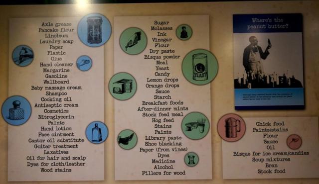 As you can see, once Carver was working at Tuskegee Institute, his focus turned to assisting the agricultural community of the south. He wanted to put food on everyone’s table. He wanted to improve the soil and thus improve the crop yield. His tests of the soil showed that their cotton crops were depleting the soil. He figured out that rotating the cotton with nitrogen rich plants like peanuts, sweet potatoes and soybeans would refresh the soil. It worked. The cotton crop was doing great as were the alternate crops they rotated in the fields… BUT, now what do you do with all those “other” crops? You need a market. There wasn’t a market for them so he made one. Back to the lab tables he went to search for answers… and back to the creator to ask “Mr. Creator, will you tell me why the peanut was made?” And, apparently, the Creator did answer because the list of products that Carver created from the peanut is long (over 300), however, it does NOT include peanut butter. I find that incredibly interesting that he never thought to grind the actual peanut into a paste and eat it. Below is a list of uses that he found for those surplus crops (in order shown on the chart): peanuts, sweet potatoes, soybeans. Not all of these products “took off” but enough of them did that crop rotation became a standard and the farmers made money both on cotton and their “alternate” crops.