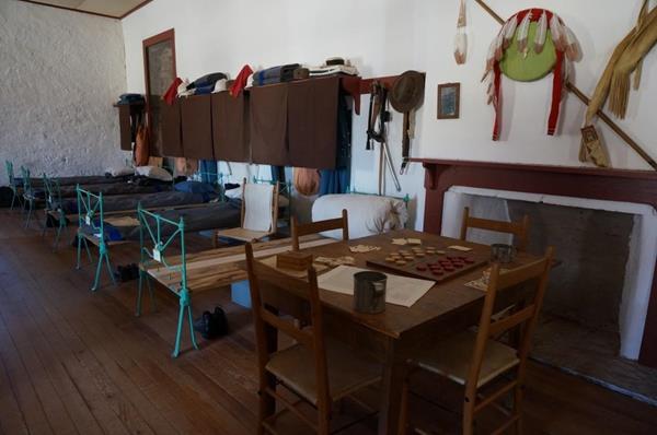 As you might expect, the enlisted men’s quarters were more Spartan with much less privacy. A row of bunks and a fireplace lined each wall. Along the center of the building were two wood-burning stoves and racks were firearms were stacked. We were told that the firearms were locked to prevent barracks fights from degenerating into shooting matches.