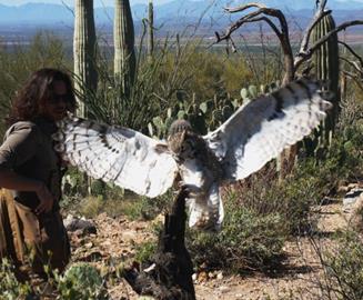 - Free Flight: this is run twice a day during the winter but switches to 10:00 am only after March 15 and stops altogether a few weeks later due to heat. You can settle above one of the animal houses or walk down the desert trail to a designated area. The keepers release birds that fly over the heads of the audience, back and forth to different dead tree perches where keepers pay them off with treats. Some of the birds fly so low that you can feel them pass overhead. We saw a Chihuahuan Raven, Grey Hawk, Great Horned Owl, and a whole family of Harris’s Hawks that take the free flying opportunity to fly far and wide in search of a quick bonus snack. These birds were displayed longer as the “hunters” had not returned. The keeper explained that if they put part of the family group away, the wandering hunters might return, realize they weren’t rejoining the family, and decide they may as well fly off and hunt some more. So they keep some near and the others return to the group before they are all called back to their aviary. These are really well trained birds. The narrator talked nonstop and told us about each bird or bird group. We learned that the Harris Hawks have a distinct hierarchy, hunt in packs, coordinate the hunt (with the lowest ranking member getting the job of hopping under the cactus to flush out the prey) and they share the kill. Pretty cool. They have a question and answer session after the flight. Here we learned that the keepers do not use audible signals because audience members might imitate them. The birds are trained to come where they are told and they get a treat. If someone in the audience was to call the birds and no treat (or not the right treat) was given, the birds could decide they weren’t going to follow that command anymore (no pay, no work, I’m going hunting).