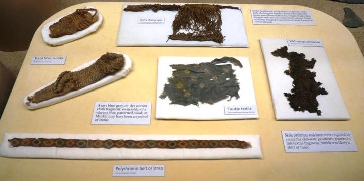 The Sinaguans were also skilled weavers. It might surprise you to learn that men, not women, wove the cloth. In the photo below you can see yucca fiber sandals (left), a girl’s skirt (top), tie-dye textile (middle), and a belt or strap (bottom).