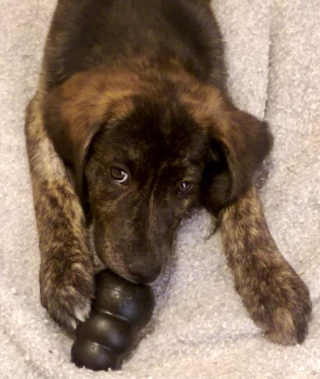 Mmmmm, Alpine finds his yummy frozen treat inside – happy puppy