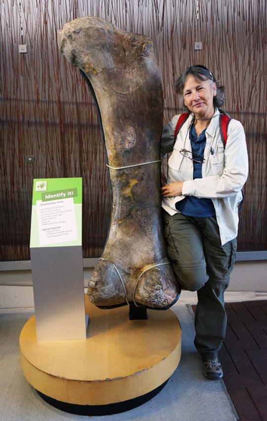 Camarasaurus thighbone compared to Holly’s thighbone. She’s 5’5″ so the Camarasaurus was… BIG!