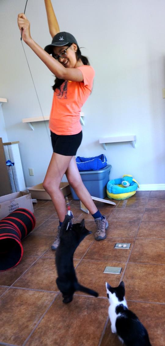 Cleaning a room took quite a bit of our shift. But that didn’t mean we didn’t get to socialize. Quite a few cats followed us around and inspected our work. Each room had seven or more litter boxes that had to be cleaned. Shelves needed to be wiped, cat beds brushed, and floors swept and mopped. Occasionally we had to stop and play with a cat or two.