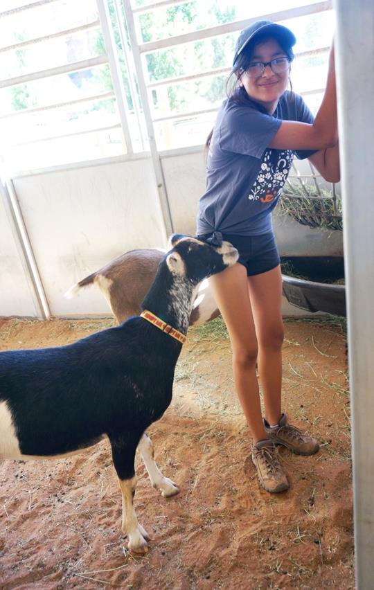 Then we spent the rest of our shift grooming them. By that time it was pretty hot so most of the goats were lying in the barn. We got to work and pretty soon the hair we brushed off the goats was floating in the air. The goats loved the attention… and Chloe. They were sure that child would be an endless supplier of treats.