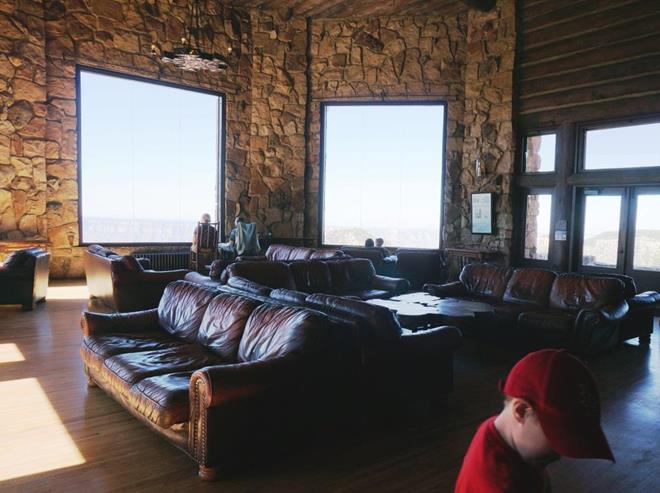 We made a quick stop at the Visitor Center to pick up the park’s Junior Ranger book before attending to our first order of business, which was to eat breakfast. So we headed for the restaurant for their all you can eat buffet which included made to order omelets. Once we were sufficiently stuffed we made our way down the stairs to the lodge great room.