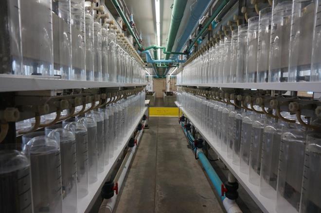 Each raceway can hold up to 170,000 three-inch salmon or 20,000 ten-inch trout. Because salmon are imprinted in hatchery waters, they return to the hatchery during their third year of life, migrating from the Missouri River.