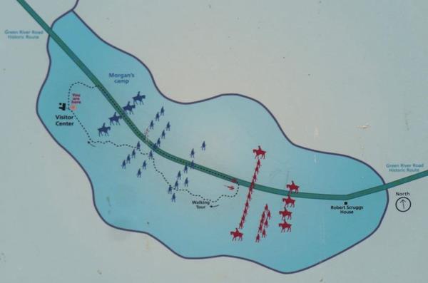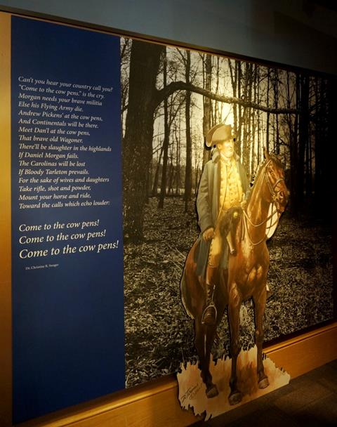A skirmish line composed of sharpshooters waited until Tarleton’s men came within shooting distance then let loose two well-aimed rifle volleys dropping two-thirds of the British officers, a tactic the British thought uncivilized. When the skirmishers fell back the British thought they were retreating and quickly advanced. In the fog of battle, orders to several American units were misunderstood resulting in an orderly retreat of two Continental army units. The advancing British took that as another sign that the battle was won and surged forward. But Morgan quickly ordered Continental troops to about face and fire at point blank range into the charging British troops. The British attack was broken and panicked Redcoats began a hasty retreat. The Continentals continued to advance while American cavalry nipped one British flank and militia swarmed the other, completing a classic double envelopment. The battle began and ended in less than an hour.