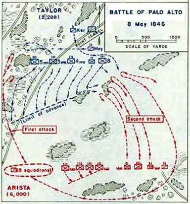 The Mexican position lay in a coastal prairie covered in needle-sharp cordgrass. US troops arrived from the north through mesquite stands. However uneven ground and sharp grass made poor terrain for infantry charges. And marshy coastal soil made cavalry maneuvers and charges difficult. So this battle was predominantly decided by artillery.