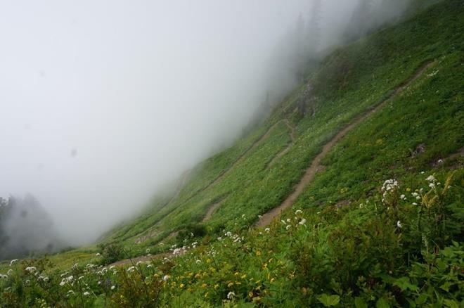 Once we got that drive out of the way, we hit the trail. We were hiking in the clouds – literally. Holly is afraid of heights… or “edges” to be more exact so she was a bit concerned about the drop offs on the side of the trail as we climbed 25 easy switchbacks up a fairly steep slope. The fact we were hiking in those clouds all the way up helped as she usually couldn’t see much more than ten feet away.