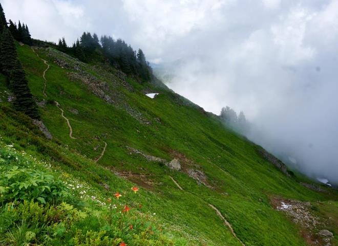 Well, 2:00 came and went and we were still in the clouds. We’d had a few glimpses of the valley, rivers, snow-capped mountains and the beautiful glacial lake but those promised views out to Mount Baker and across the ridges of the Cascades never showed. We finally decided to head out. What a surprise to find that we hiked down OUT of the clouds and there, below us, the river valley and town of Concrete WERE experiencing 40% cloud cover. One of those clouds just happened to be sitting smack dab on the top of Sauk Mountain.