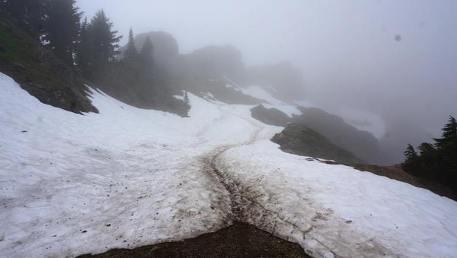 We knew the cloud cover was going to be heavy in the morning so we skipped our normal early hike start time and headed into the town of Concrete for a nice breakfast first. Then we headed up Sauk Mountain Road. This is a mostly decent gravel road that switchbacks up the mountain so that your car does most of the climbing for you. The only bad spot for us was the last curve before the parking lot. With the overnight rain and mist, the road was wet and our all-wheel drive Subaru had problems with a couple of monster pot holes. We should have turned off the traction control system. If you have that on your car, make sure you know where the button is to turn it off for situations like this. It is better to have a few tires gripping the road instead of all four locking up as you slide back down the mountain. We did finally make it all the way up. A friend went up later in a van and parked on the gravel pull-off just before the bad spot and hiked up the last bit so you don’t need a four-wheel drive vehicle to do this hike.