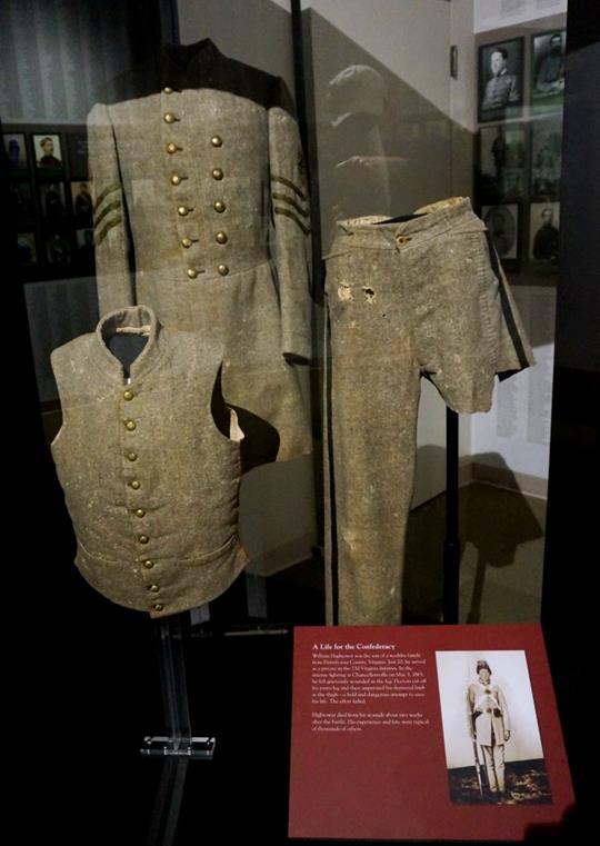 The soldiers on both sides that fought here volunteered or were drafted. Their stories are told too. Private William Hightower served in the 23rd Virginia Infantry. On May 3rd he was seriously wounded and his leg was amputated at the thigh. He died two weeks later. The uniform he was wearing when he was wounded is on display.