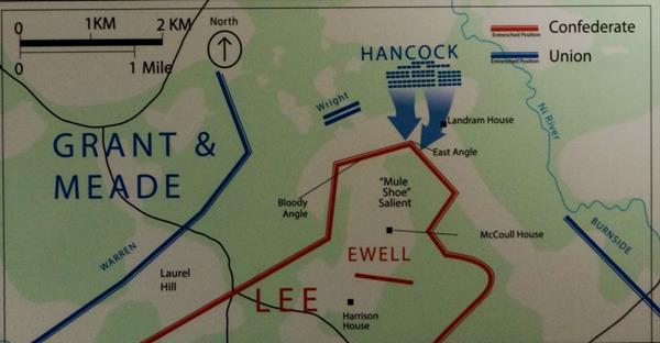 Lee barely won the race to the court house and dug in. His lines formed a half-mile wide salient, or bulge, that became known as the Mule Shoe. Some of the fiercest, most brutal fighting of the war occurred here. And it was here that Union forces experimented with new tactics.