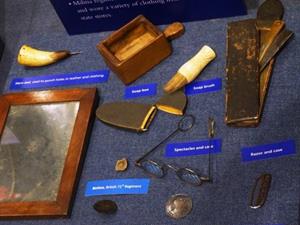 The museum had a very nice collection of artifacts – personal items such as spectacles, a razor, and looking glass (mirror); mess items like forks, tinderlighters (to start campfires), and canteen; leisure items like pipes, dice, dominoes, a quill pen and inkwell.