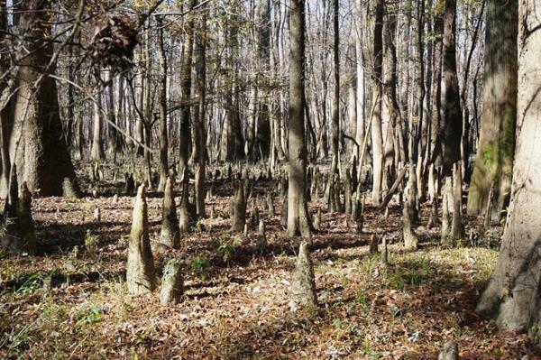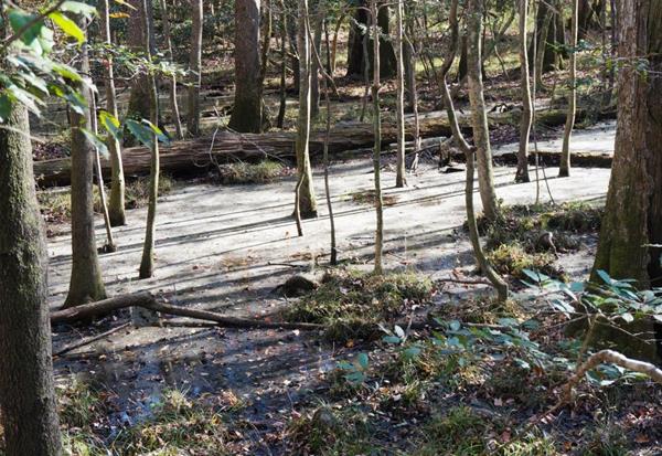 Bald cypress knees abound here, but not much is known about their function. Cypress trees can live up to 1,000 years. Because it was rot and water resistant, Native Americans used cypress wood for canoes. In the late 1800s, bald cypress were extensively logged and used for shingles, docks, bridges, etc., which is why few old growth bald cypress forests remain.