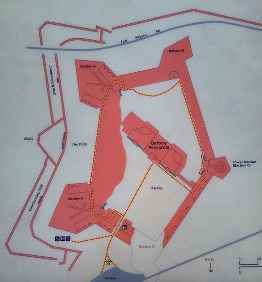 One reinforced concrete battery, Battery Pensacola, was built in the middle of the fort. A total of ten costal batteries were built here in the early 20th century to protect Pensacola and were used through World War II.