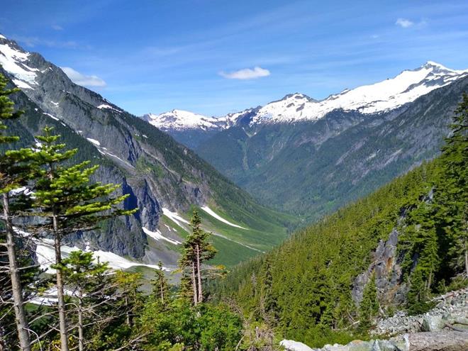 The road didn’t melt out until July so we hit the trail just three days after they opened the gate to let us drive up the rest of the way to the parking lot. And what a parking lot it is! We frequently sent visitors to the parking lot even if they weren’t planning to hike. You have a huge glacial valley sweeping out away from you, snow covered peaks, glaciers, waterfalls, wildflowers and thick trees.